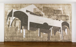 This is what happened in the work Nave (Ship, July- October 2013). In it a fragment of a 17th Century building is unfolded and re-configured on the wall, This work is done and undone on a big wall in a process that generates new images that convey, on the one hand, the inevitable passage of time and, on the other, the creation of a kind of archeology of the image in which memory and the present come harmoniously together. The same principle of this painting is the un-concealment, and it takes place on the wall with mud that the artist picks in several parts of the country. Architectural drawings that somehow remind us of historic buildings are created on the wall and then erased with water, leaving a trace behind that amalgamates with other, creating a futuristic image that appears to float in the space thanks to the movement of this image that, created with several layers, seems to rotate over its own axis. Photographs and a video serve as testimony of this process that only a few have been able to see.